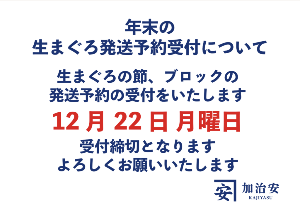 まぐろデリの加治安 まぐろ直売(無人販売店舗)|年末年始のお休み・発送予約について 2025.12.11 お知らせ 12月30日(火)は 12時まで営業 いたします。12月31日(水)、1月1日(木)、1月2日(金)、1月3日(土)は 休業 とさせていただきます。 Prev 一覧へ戻る
